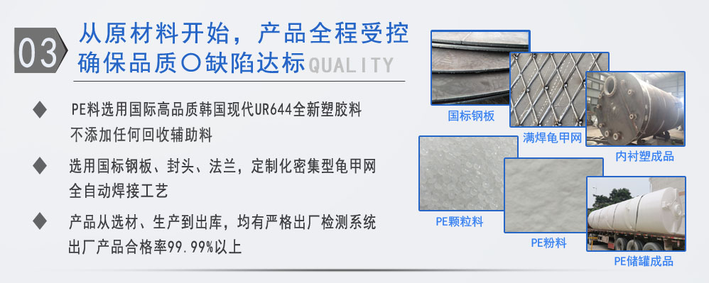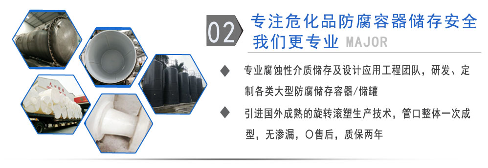 公司有鋼襯塑PE/PO、PE全塑、碳鋼、不銹鋼四大系列100多個品種,專注于常壓儲存容器生產,其產品包括鋼襯塑儲罐、管口一體成型PE儲罐碳鋼儲罐、不銹鋼儲罐、反應釜、攪拌罐、離子交換柱、鋼襯PE/PO儲罐、塑料儲罐、鹽酸儲罐、硫酸儲罐等等。更大限度滿足廣大客戶的各種需求,同時可以根據客戶的需要加工定制各種防腐設備。
